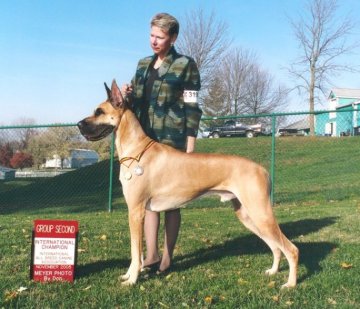 Am./Int. Champion K-D Dane You Had Me From Hello "Abner" is owned by Glenda and Leo Burns Handled to AKC Title by Linda Cain Handled to Int. Title by Renee "Uno"