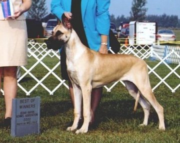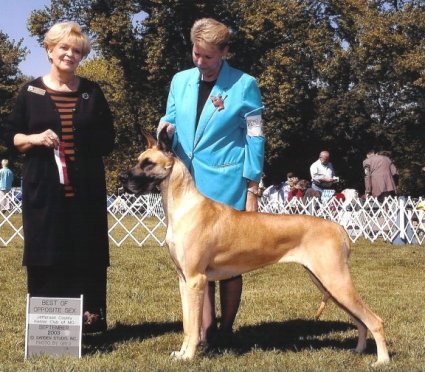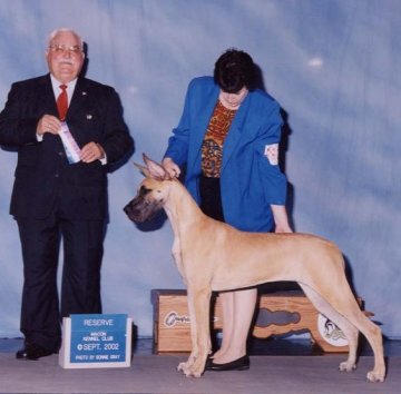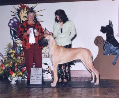BISS Champion K-D Dane's Southern Accent v. Dixie Pictured at 8 months Winning a Class Placement at 2002 National Specialty Owned by Lori Cornelius Handled by B.J. Barnhardt Tobi is CERF normal, Cardiac normal, Thyroid normal & Hips OFA "Good", CHIC #17624